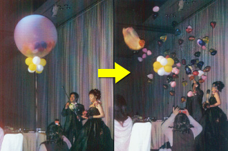 最後にはメインとなる大きな(直径120cm位)メインバルーンを開いて頂きます。瞬間的に大きなバルーンが消滅して、色とりどりの小さなハートのバルーンに姿を変えます。