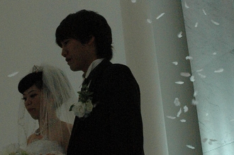 二人が教会から出てきたとき、ゲストの歓声と宙を舞うシャボン玉が出迎える。
