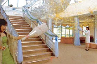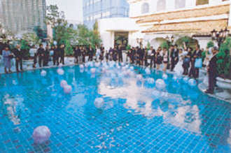皆さんに一つずつお持ちいただき、全員一斉にプールに投げ込みます。