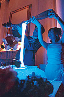 このブライトファンタジアは昔ながらの“水合わせの儀”を現代風にアレンジしたものです。お二人で特殊な液体を注ぎます。二つの液体が一つになった瞬間、光が浮き上がる演出です。お色直しで登場する際に、ゲストのテーブルをまわるキャンドルサービスのかわりに、二種類の液体を混ぜることによって起こる科学反応を利用した幻想的な光の演出はいかがでしょう。